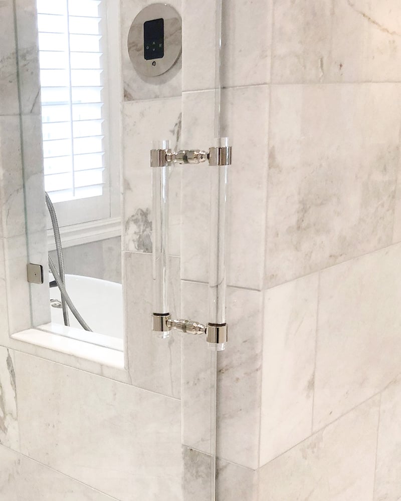 Lucite and solid brass shower door pull, made from the finest cast acrylic. Sold as a pair with back-to-back mounting. Nylon washers are provided for a tight fit. Designed for a 0.25 inch to 0.5 inchglass door thickness.